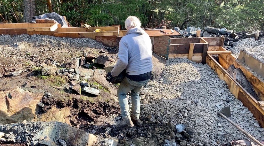 When we returned to our little tiny home on Salt Spring Island, very much rested and refreshed after a dip in Radium Hot Springs on the way back, we threw ourselves into continuing the preparations of our build site in readiness to construct our eco-home. Throughout January and some of February we were engaged in backbreaking work - using the excavator and rock hammer to break up some areas of solid bed rock and clearing away large boulders and also moving buckets of smaller rocks and gravel away by hand, so that we could frame up the footings. It seemed to take forever…